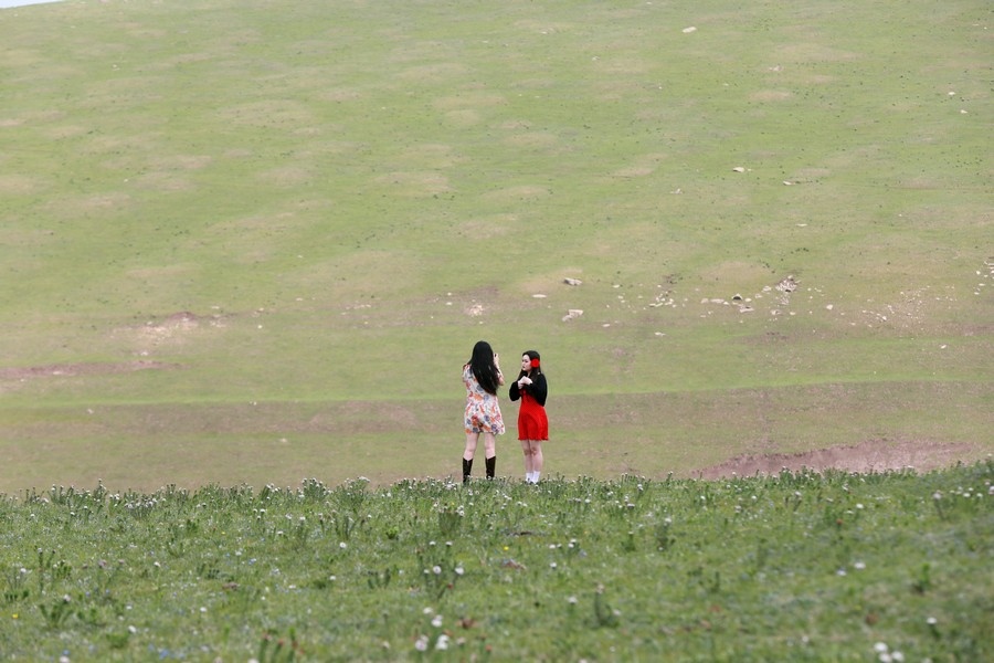 演員演出間隙在草原上拍照打卡 記者 張楊攝影