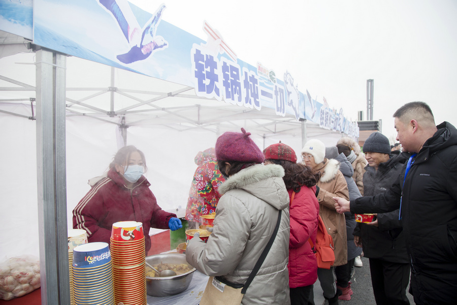 1月4日清晨,游客在房車營地內(nèi)排隊領(lǐng)取鐵鍋燴菜