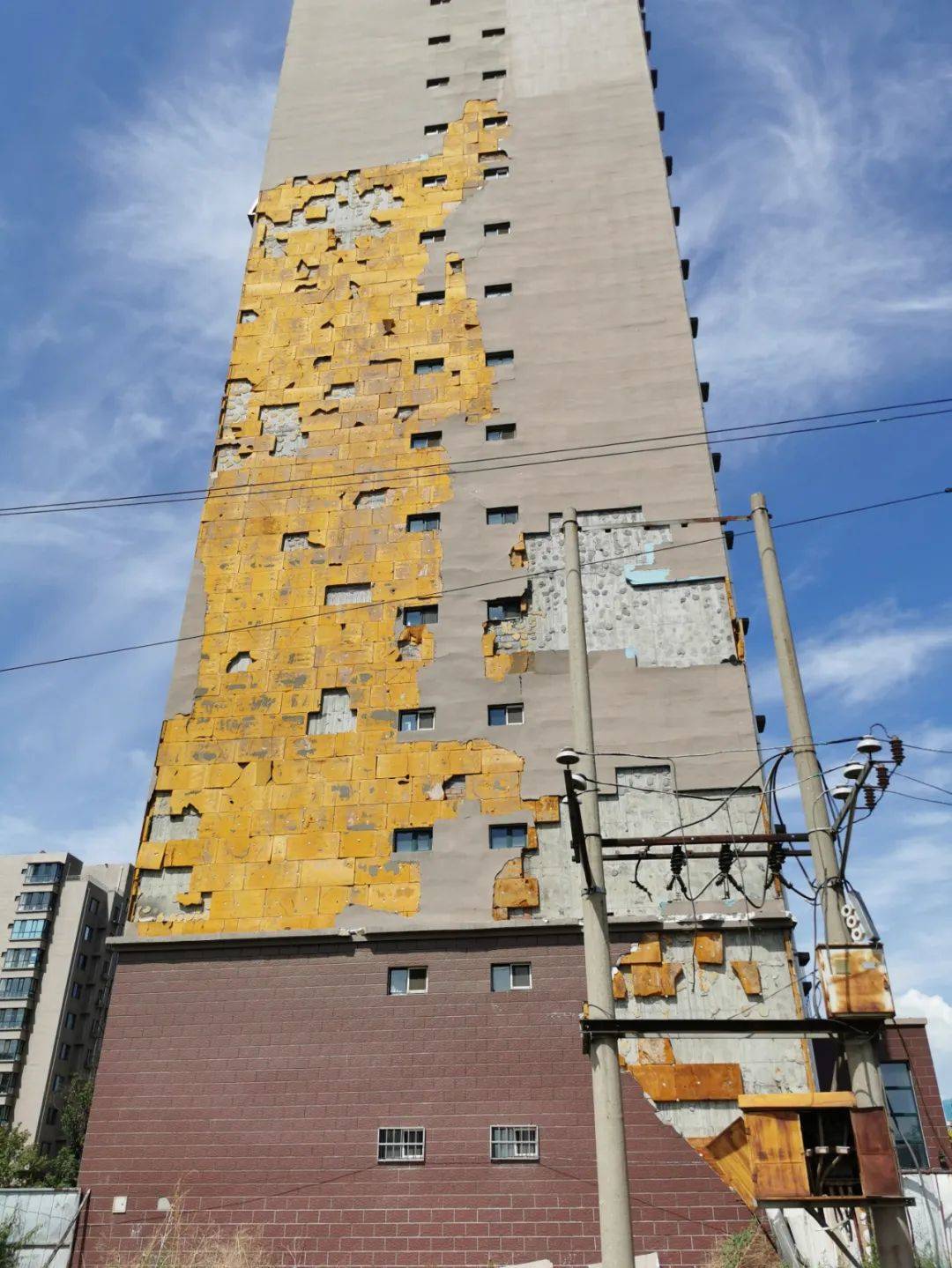 7月1日10時(shí)許,記者來(lái)到聞都雅苑4號(hào)樓下,抬頭望去,該棟樓西側(cè)墻壁有三處地方出現(xiàn)破損,大片的墻皮和里面的保溫層均已脫落。記者注意到,聞都雅苑共有4棟高層,該小區(qū)只有東西和南北兩條主干道以及西側(cè)一條小走廊,而4號(hào)樓正好位于南北主干道一側(cè)。據(jù)小區(qū)居民郝先生介紹,不斷掉落的保溫層已經(jīng)威脅到了居民的人身安全。今年5月6日,呼和浩特市出現(xiàn)大風(fēng)天氣,在風(fēng)力的作用下,4號(hào)樓東西兩側(cè)的外墻保溫層出現(xiàn)大面積脫落,一位恰巧路過(guò)4號(hào)樓西側(cè)的女性業(yè)主不幸被掉落的材料砸中,導(dǎo)致腿部受傷,此事也給小區(qū)居民帶來(lái)了恐慌。