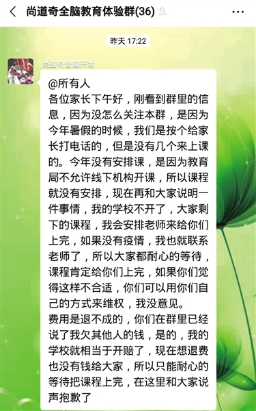 根據(jù)謝女士提供的轉(zhuǎn)賬證明和聊天截圖記者注意到,“尚道奇全腦教育體驗群”1月15日發(fā)布的一則通知稱,今年暑假,機構老師曾挨個給家長打電話通知上課,但是沒有幾個來上課的,加上教育局不允許線下機構開課,所以課程遲遲沒有安排。并稱學校賠錢了,沒有錢退給大家,只能耐心等待疫情結(jié)束后安排上課,如果家長覺得不合適,可以用自己的方式維權?!八恼f辭明顯前后矛盾,暑假期間說課件損毀,現(xiàn)在又說沒學生上課?!敝x女士氣憤地說,和她遭遇同樣情況的還有30多名家長,399元雖然不是大數(shù)目,但這樣欺騙大家實屬不該。