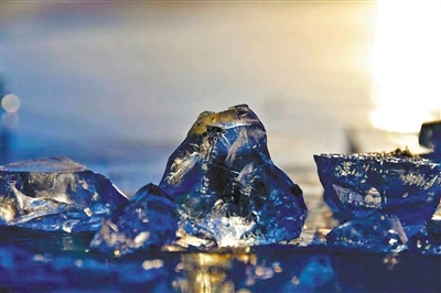 冰塊在夕陽霞光的照耀下,變身冬日瑪瑙,晶瑩剔透,溢光流彩。潔凈的冰面像龜背一樣裂出美麗的紋理,與夜晚琥珀色的天空相映成趣,令人眩目,美妙無比。 鄭廣鑫 攝