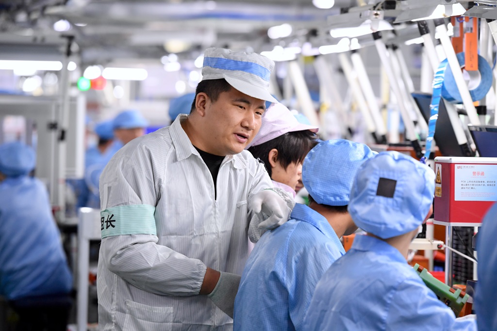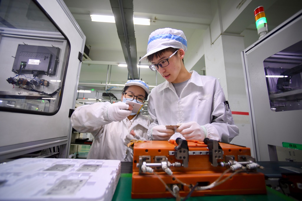 福建省飛毛腿高級技工學(xué)校三年級寧夏籍學(xué)生海鵬(右)在飛毛腿(福建)電子有限公司車間實習(xí)(2021年3月4日攝)。