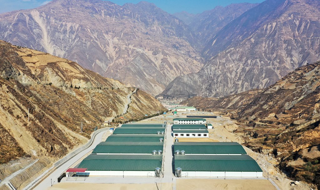 這是青島市幫扶建設(shè)的甘肅隴南市武都區(qū)康大肉兔養(yǎng)殖場(2021年1月19日攝,無人機照片)。