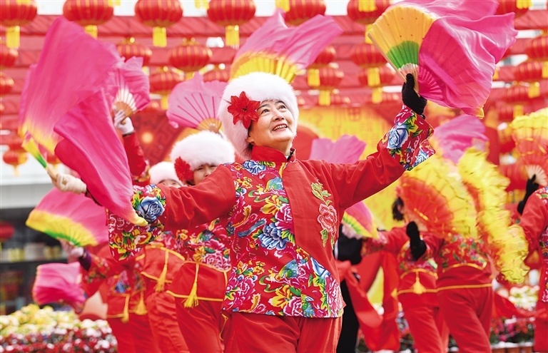 2月14日,演員們在內蒙古展覽館廣場上跳起歡快的舞蹈。當日,內蒙古展覽館開展“傳統(tǒng)文化月月傳”邀您一起鬧元宵活動。記者 王磊 攝