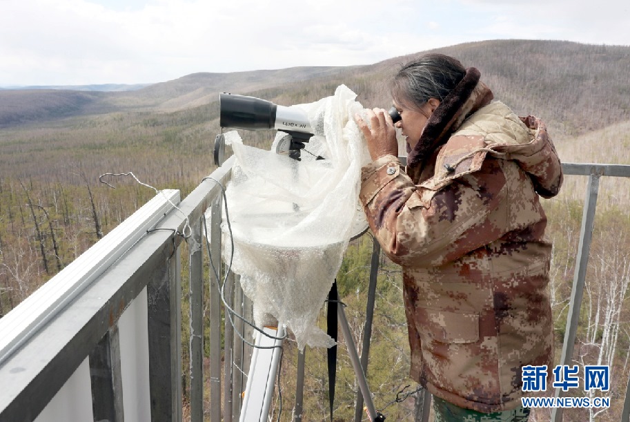 5月11日,57歲的森防瞭望員周桂波站在22米高的瞭望塔上,穿著棉襖棉褲頂著寒風(fēng)瞭望、匯報、記錄。新華網(wǎng)發(fā)(欒維敬 攝)