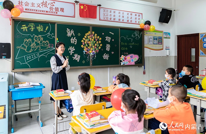 呼和浩特市玉泉區(qū)南柴火市街小學(xué)的師生們?cè)跉g迎一年級(jí)新生入校。丁根厚攝