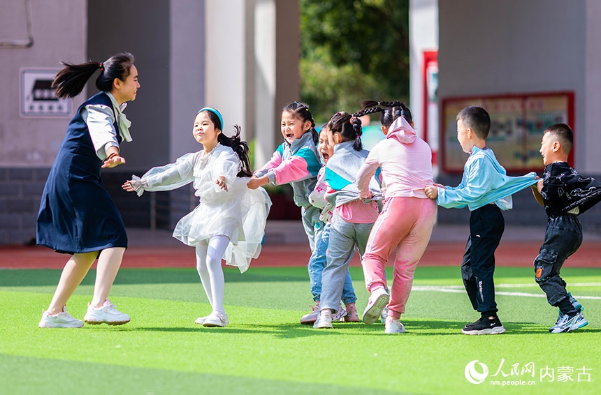 呼和浩特市玉泉區(qū)南柴火市街小學(xué)老師和一年級(jí)新生在操場(chǎng)上玩游戲。丁根厚攝