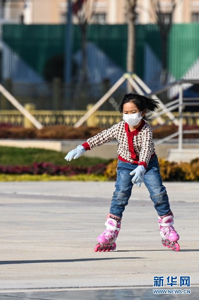 11月17日,小朋友在呼和浩特市新華廣場(chǎng)練習(xí)輪滑。新華社記者 王澤聰 攝