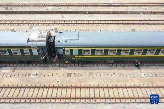 4月28日,中國(guó)鐵路上海局集團(tuán)有限公司徐州站的鐵路連結(jié)員在對(duì)臨時(shí)旅客列車(chē)進(jìn)行拉風(fēng)作業(yè)(無(wú)人機(jī)照片)。