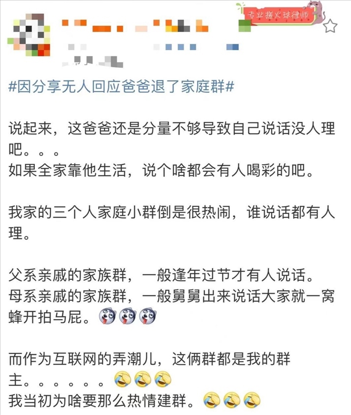 日前,一則“因分享無人回應(yīng)爸爸退了家庭群”的話題引發(fā)公眾關(guān)注,登上熱搜。
