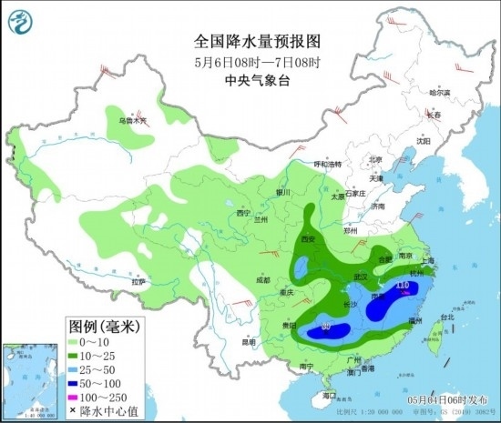 5月6日08時至7日08時,陜西中南部、江漢大部、江淮西部、江南、西南地區(qū)東北部、華南北部等地部分地區(qū)有中到大雨,其中,湖南南部、江西中部和東北部、浙江西南部、福建西北部、廣西北部等地部分地區(qū)有暴雨或大暴雨(100~110毫米)。內(nèi)蒙古中部和西北部、黑龍江東北部、吉林中部、新疆沿天山地區(qū)、河南南部、四川盆地西北部、四川南部、貴州東北部等地部分地區(qū)有4~6級風(fēng),其中,內(nèi)蒙古東北部、新疆北疆北部等地部分地區(qū)有6~7級風(fēng)。
