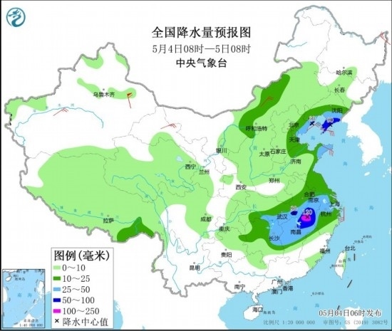 5月4日08時至5日08時,湖北南部和東部、安徽南部、湖南東北部、江西中北部、浙江西部、江蘇南部以及山東半島、遼寧南部、河北東部等地部分地區(qū)有大到暴雨,其中,安徽南部、江西北部等地部分地區(qū)有大暴雨(100~120毫米)。上述部分地區(qū)伴有短時強降水(最大小時降雨量20~40毫米,局地可超過50毫米),局地有雷暴大風(fēng)等強對流天氣。內(nèi)蒙古中部、黑龍江東北部、新疆南疆盆地、甘肅河西、山東半島等地部分地區(qū)有4~6級風(fēng),其中,新疆東部部分地區(qū)有8~9級風(fēng)。渤海、渤海海峽、黃海大部、東海北部海域?qū)⒂?~8級、陣風(fēng)9~10級的大風(fēng)。
