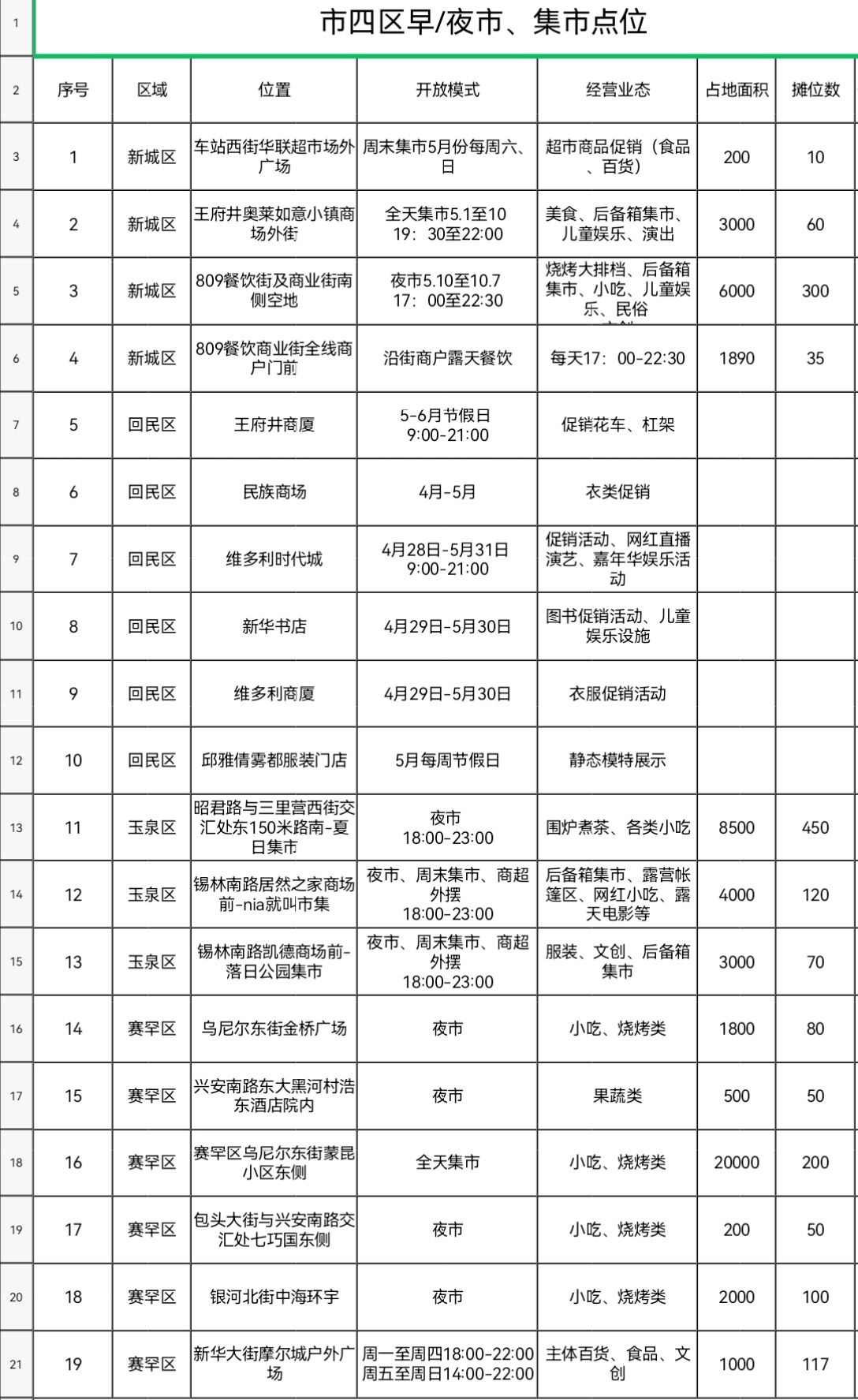 賽罕區(qū)6個(gè),包括烏尼爾東街金橋廣場、興安南路東大黑河村浩東酒店院內(nèi)、賽罕區(qū)烏尼爾東街蒙昆小區(qū)東側(cè)、包頭大街與興安南路交會(huì)處七巧國東側(cè)、銀河北街中海環(huán)宇的夜市、全天集市,以及新華大街摩爾城戶外廣場售賣主體百貨、食品、文創(chuàng)的點(diǎn)位。