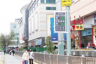 5月7日上午,在中山西路,記者看到懸掛的智能停車(chē)指引屏上顯示附近停車(chē)場(chǎng)的位置,以及停車(chē)場(chǎng)的停車(chē)位余量。維多利購(gòu)物中心附近的一個(gè)智能停車(chē)指引屏上顯示民族大世界有7個(gè)空余停車(chē)位、民族商場(chǎng)有18個(gè)空余停車(chē)位,而這些數(shù)據(jù)也在實(shí)時(shí)更新,市民根據(jù)智能停車(chē)指引屏的信息便能輕松找到停車(chē)位,不用再為停車(chē)難而發(fā)愁。