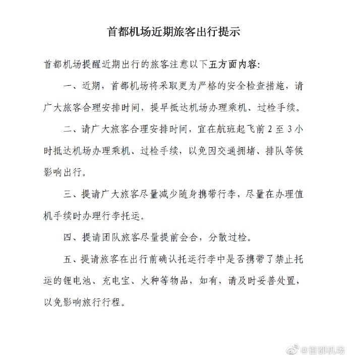 央視網(wǎng)消息:5月16日,@首都機(jī)場(chǎng) 官方微博發(fā)布提示:首都機(jī)場(chǎng)近期將采取更為嚴(yán)格的安全檢查措施,請(qǐng)廣大旅客合理安排時(shí)間,提早抵達(dá)機(jī)場(chǎng)辦理乘機(jī)、過檢手續(xù)。