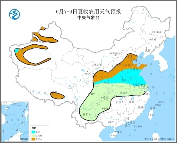 預(yù)計(jì)6月7-9日,夏收區(qū)大部多晴好天氣,利于搶晴收曬已成熟冬小麥和加快夏收進(jìn)度;河南、陜西等地前期降水偏多地區(qū)的低洼麥田漬澇將減輕,為麥?zhǔn)諜C(jī)械化作業(yè)逐步創(chuàng)造條件。未來(lái)3天,河北中東部和南部、河南北部、山西東南部、山東西部、安徽東部等地的局部地區(qū)將有雷暴大風(fēng)或冰雹等強(qiáng)對(duì)流天氣,冬小麥點(diǎn)片倒伏風(fēng)險(xiǎn)較高,對(duì)未成熟小麥籽粒充分灌漿不利,并將增加已成熟小麥機(jī)收難度。7-14日華北、黃淮、新疆等地部分地區(qū)將有35℃以上高溫天氣,局地日最高氣溫在37℃以上,上述地區(qū)堆積的濕麥發(fā)熱霉變的風(fēng)險(xiǎn)較高,新疆冬小麥遭受干熱風(fēng)災(zāi)害的風(fēng)險(xiǎn)也較高。