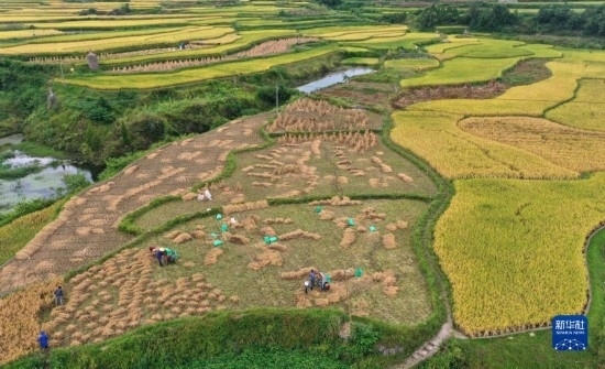 金秋時節(jié),各地農(nóng)民搶抓晴好天氣忙收獲,田間地頭一派繁忙景象。新華社發(fā)(胡攀學 攝)