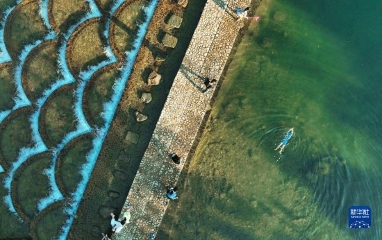 7月11日,人們在杭州臨安高虹鎮(zhèn)的龍鱗壩戲水(無人機(jī)照片)。