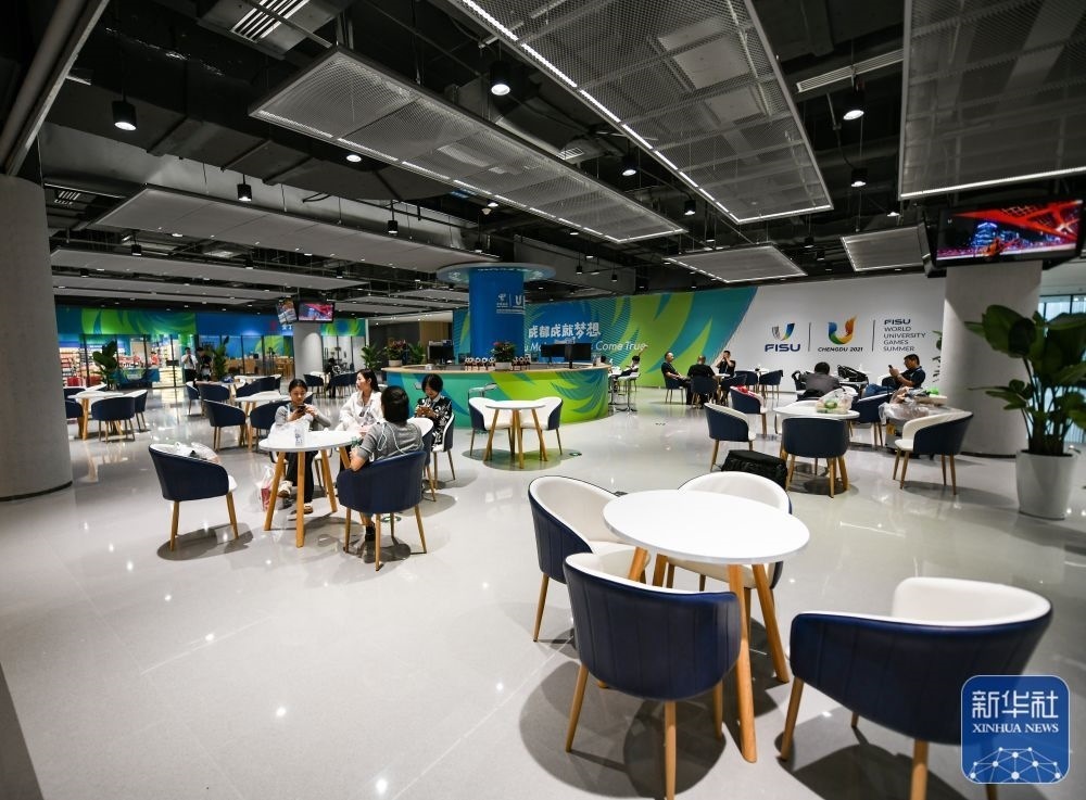 ?↑這是7月13日拍攝的成都大運(yùn)會(huì)主媒體中心的會(huì)客廳。新華社記者 王曦 攝