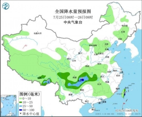 預計,7月24日08時至25日08時,四川盆地中南部、重慶大部、貴州北部、云南東北部、湖北西南部、湖南西北部以及浙江南部、福建中北部、江西南部、黑龍江北部、西藏東部等地部分地區(qū)有大到暴雨,其中,重慶南部等地局部地區(qū)有大暴雨(100~140毫米)。上述部分地區(qū)伴有短時強降水(最大小時降雨量30~50毫米,局地可超過70毫米),局地有雷暴大風等強對流天氣。中央氣象臺7月24日06時繼續(xù)發(fā)布暴雨藍色預警。