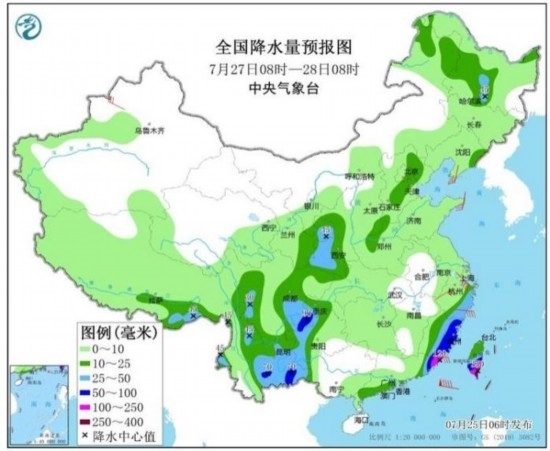 圖3 全國(guó)降水量預(yù)報(bào)圖(7月25日08時(shí)-26日08時(shí))