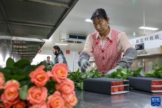 在云天化晉寧花卉產(chǎn)業(yè)現(xiàn)代化示范園內(nèi),一名花農(nóng)在對(duì)包裝流水線上的鮮花進(jìn)行包裝(7月12日攝)。新華社記者 崔文 攝