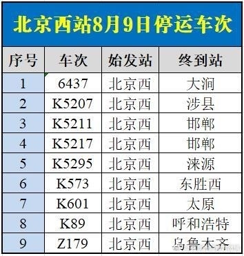 央視網(wǎng)消息:據(jù)@北京西站官方微博 消息,受水害影響,8月9日北京西站、北京豐臺站部分列車停運,已購買停運列車車票的旅客,可于30日內辦理全額退票手續(xù)。請廣大旅客合理安排出行,關注鐵路部門公告。