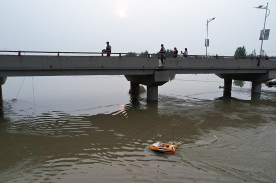 海委水文局水文應(yīng)急監(jiān)測(cè)小分隊(duì)在大清河上測(cè)流作業(yè)。新華社記者 劉詩(shī)平 攝