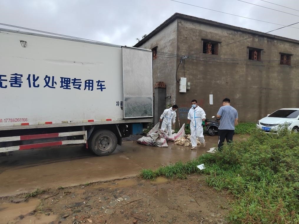 河北省雞澤縣一家蛋雞養(yǎng)殖場門口,專業(yè)人員對養(yǎng)殖場內淹死的蛋雞進行集中收集裝車。(雞澤縣農(nóng)業(yè)農(nóng)村局供圖)