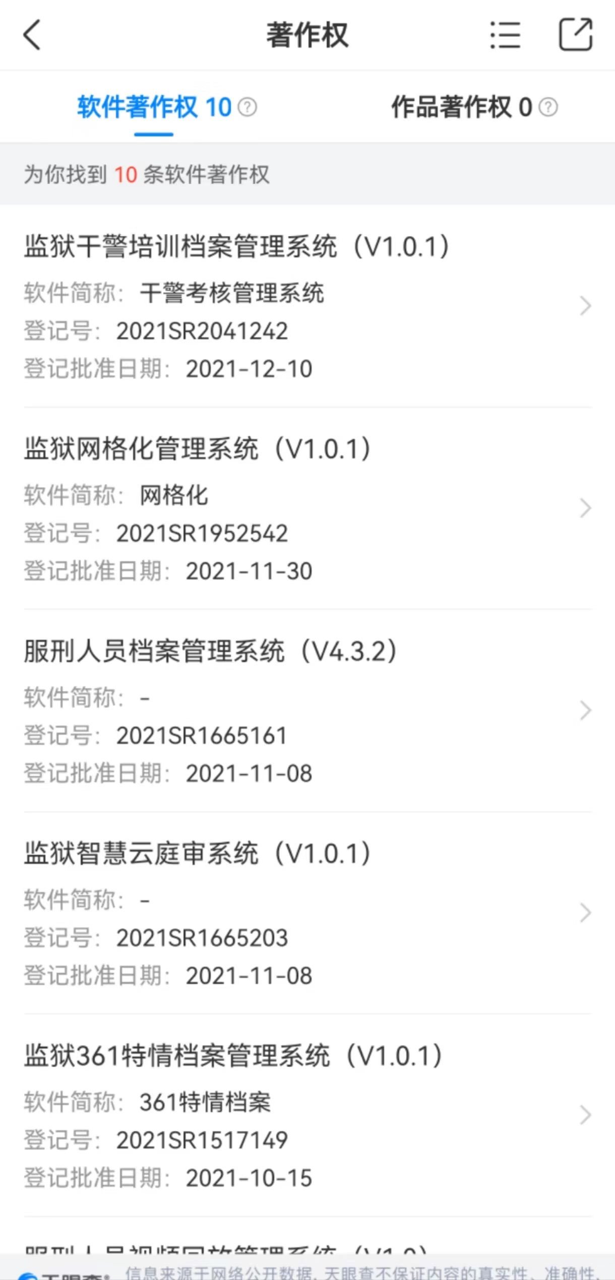 如上述立馳信息在官網(wǎng)中的自我介紹,澎湃新聞通過(guò)天眼查App檢索發(fā)現(xiàn),2021年一整年,立馳信息就獲批登記了包括上述“親情會(huì)見(jiàn)1.0”在內(nèi)的多個(gè)涉監(jiān)獄管理的系統(tǒng)。如監(jiān)獄固定資產(chǎn)管理系統(tǒng)、點(diǎn)名管理系統(tǒng)、服刑人員會(huì)見(jiàn)管理系統(tǒng)、監(jiān)獄干警培訓(xùn)檔案管理系統(tǒng)等共計(jì)10項(xiàng)。