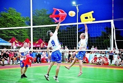海南“村排”龍樓站賽間,球員為觀眾表演具有文昌特色的“凳子排球”。新華社發(fā)