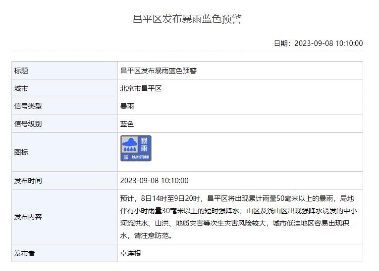 9月8日10時(shí)北京發(fā)布暴雨藍(lán)色預(yù)警 昌平區(qū)有暴雨、門頭溝區(qū)有雨