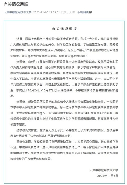 ·天津中德應(yīng)用技術(shù)大學(xué)通報助學(xué)金事件調(diào)查結(jié)果:不存在國家助學(xué)金名額遭“擠占”情況。