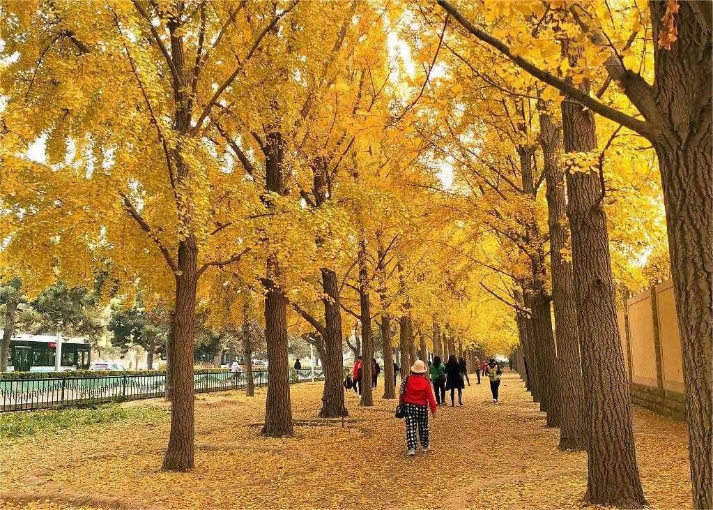 北京釣魚臺銀杏大道一片金黃,進(jìn)入最佳觀賞期,吸引市民前來打卡游玩拍照。