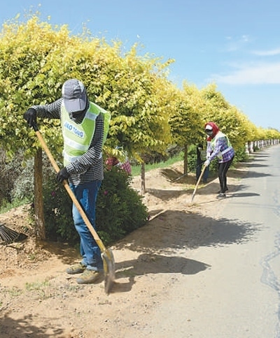 磴口縣防沙治沙局森林管護(hù)大隊(duì)工作人員在為堤防公路兩側(cè)的林帶除草。張 棖 邢 皓攝影報道