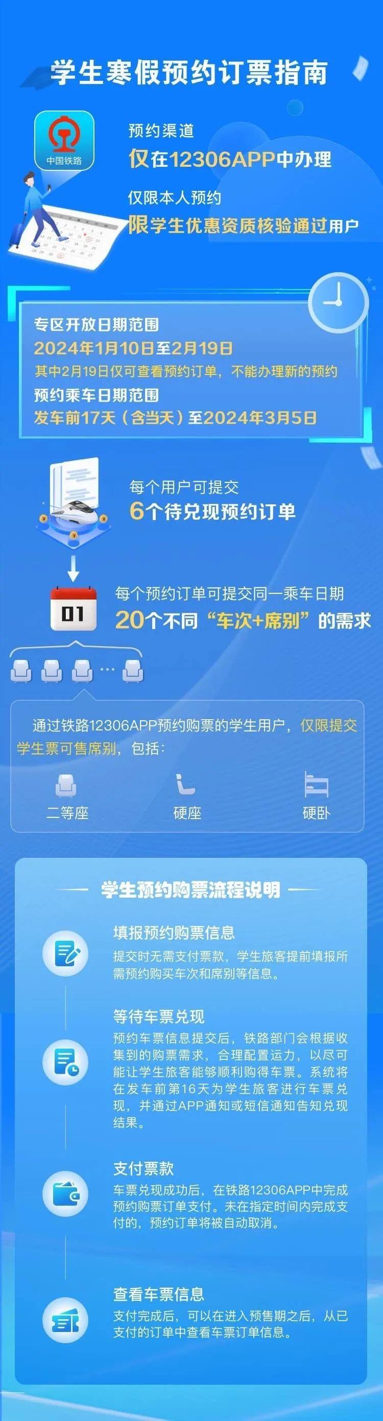 為認(rèn)真貫徹落實(shí)黨中央國(guó)務(wù)院關(guān)于做好2024年元旦春節(jié)期間有關(guān)工作的要求,保障學(xué)生、務(wù)工人員等重點(diǎn)群體春運(yùn)出行,鐵路12306創(chuàng)新服務(wù)舉措,為學(xué)生、務(wù)工人員推出了售票服務(wù)專區(qū)。自1月10日起,符合條件的學(xué)生旅客(已通過學(xué)生優(yōu)惠資質(zhì)核驗(yàn)且有剩余優(yōu)惠乘車次數(shù))可通過“學(xué)生寒假訂票專項(xiàng)服務(wù)”專區(qū)預(yù)約購(gòu)買春運(yùn)期間(1月26日至3月5日)火車票,每名旅客最多可同時(shí)提交6個(gè)預(yù)約訂單,每個(gè)訂單可添加1個(gè)乘車日期的20個(gè)“車次+席別”的組合,可選席別為學(xué)生優(yōu)惠票適用的硬座、硬臥、二等座。已通過實(shí)名制核驗(yàn)的務(wù)工人員可通過“務(wù)工人員春運(yùn)預(yù)約訂票服務(wù)”專區(qū)預(yù)約購(gòu)買春運(yùn)期間火車票,每名旅客可同時(shí)提交6個(gè)預(yù)約訂單,每個(gè)訂單可選擇“時(shí)間+車次+席別”的1個(gè)組合。