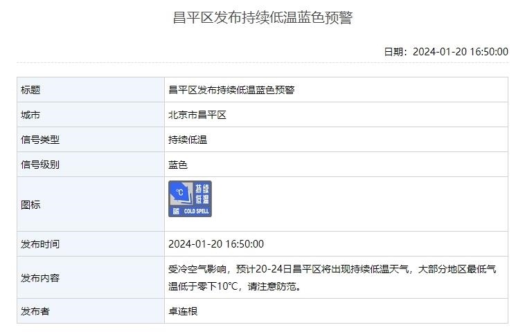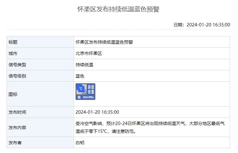 1月20日,北京延慶、懷柔、昌平3區(qū)發(fā)布持續(xù)低溫藍色預(yù)警。受冷空氣影響,預(yù)計20—24日這3個區(qū)將出現(xiàn)持續(xù)低溫天氣,其中延慶、懷柔兩地大部分地區(qū)氣溫低于零下15℃,請注意防范。