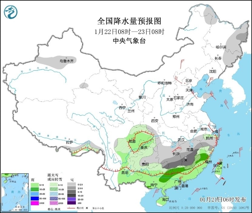 22日,湖南南部、江西中南部、福建西部、廣西東北部、廣東北部等地的部分地區(qū)有大雪(5~9毫米)。上述部分地區(qū)新增積雪深度2~6厘米,局地可達(dá)8厘米以上。