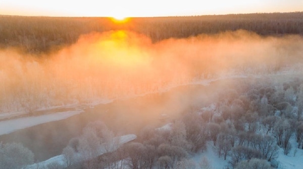 日出時(shí)分,在黑龍江省遜克縣克林鎮(zhèn)平臺村附近的大平臺霧凇景區(qū)拍攝的霧凇景觀。