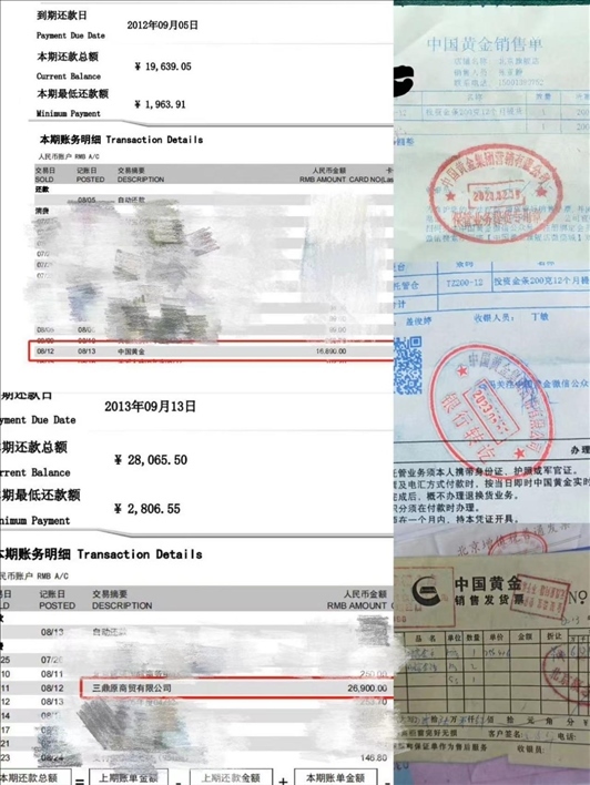 王鑫民:09年時候,他們跟順義那邊就有一個中國黃金店,就賣投資的黃金。我們想說買點,將來自個老了以后能有一保證。他說,你要能寄存到這兒,還能給你點小禮品,我們想挺好的,你擱家多不安全,這么貴重的東西,我們就擱他那了,他給我們開單子。后來,順義這店搬到雙井去了,這是中國黃金的,而且商場更大,誰不都得放心。我們想跟他們也熟了,每年有點兒錢就買一點兒,還安全,還有點小獎品,左一回買右一回買的,他店員都認(rèn)得我們了,挺熟的。他突然給我們打電話說:這出事了,你們趕緊過來。