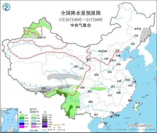 3月20日08時至21日08時,黑龍江東南部、吉林東部、新疆沿天山地區(qū)、西藏東部和南部、青海南部、川西高原中部等地部分地區(qū)有小到中雪或雨夾雪,其中,西藏東部、川西高原中部等地部分地區(qū)有大雪。西藏東南部、四川南部、云南中西部等地部分地區(qū)有小雨,其中,西藏東南部、云南中西部等地部分地區(qū)有中雨。