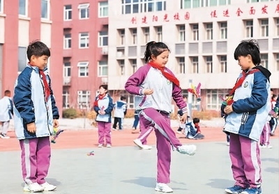 河北省邢臺市廣宗縣第四小學學生在課間踢毽子。王 壘攝(人民視覺)