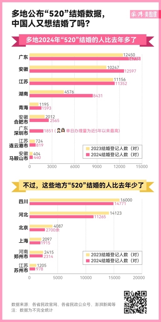 2023 年多地“520”領(lǐng)證人數(shù)下跌,引起熱議。2024 年的“520”剛剛過去,多地披露了當日結(jié)婚登記數(shù)。廣東、安徽、江蘇等省當日領(lǐng)證人數(shù)較去年有回升。澎湃新聞從深圳市民政局獲悉,截至 5 月 20 日 18 時 30 分,“520”全天共辦理結(jié)婚登記 1851 對,單日辦理量為近 5 年以來最高。中國人又重燃對婚姻的渴望了嗎?