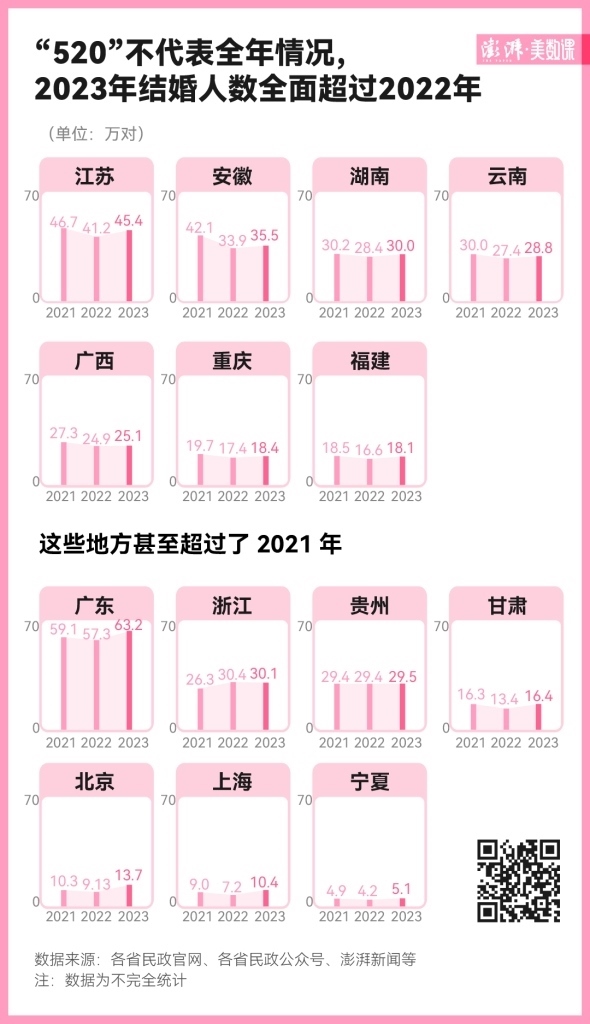 2023 年多地的“520”領(lǐng)證人數(shù)下跌,媒體報道稱“年輕人不太愿為愛結(jié)婚了”,但實際上,全年情況卻沒這么慘淡。