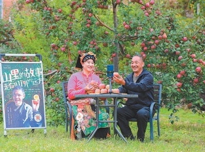 四川省小金縣沃日鎮(zhèn)木欄村,電商主播同果農(nóng)一起直播賣蘋果。嚴(yán)易程攝(人民視覺)