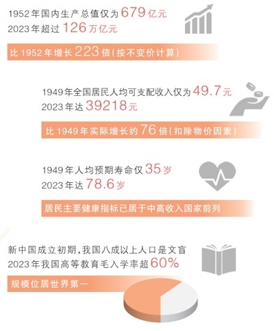 各行各業(yè)的發(fā)展成就,人民生活的蒸蒸日上,濃縮在一組組數(shù)據(jù)中。與新中國成立初期相比,2023年國內(nèi)生產(chǎn)總值增長223倍、人均GDP增長89倍、人均預(yù)期壽命提高43.6歲、農(nóng)村貧困人口全部脫貧……國家統(tǒng)計(jì)局近日發(fā)布新中國成立75年經(jīng)濟(jì)社會(huì)發(fā)展成就系列報(bào)告,“數(shù)”說75年偉大成就,本版“大數(shù)據(jù)觀察”欄目推出特別報(bào)道,記錄同心同德、艱苦奮斗的奮進(jìn)歷程,匯聚共襄強(qiáng)國建設(shè)、民族復(fù)興偉業(yè)的磅礴力量。