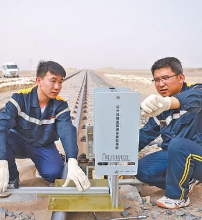 打開紅外線軸溫探測設(shè)備(THDS)的機蓋,映入眼簾的是一層厚厚的沙塵。臺欣龍熟練地拿出吹風(fēng)機、毛刷,仔細(xì)清理室外探頭箱里的沙塵,再把黑體(一種檢測設(shè)備)放置在探頭箱上,進(jìn)行溫度檢測校準(zhǔn)。