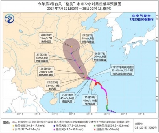 今年第3號臺風(fēng)“格美”未來72小時路徑概率預(yù)報圖(7月25日05時-28日05時)