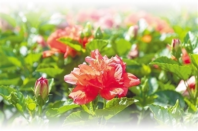 疑若焰生、朝開暮落的朱槿花,在我國古代文學(xué)記載中非常豐富,被賦予了深厚的人文內(nèi)涵。“瘴煙長暖無霜雪,槿艷繁花滿樹紅。每嘆芳菲四時(shí)厭,不知開落有春風(fēng)?!碧拼娙死罴澗驮谠娭匈潎@,“無霜雪”環(huán)境下生長的朱槿花四季常美。
