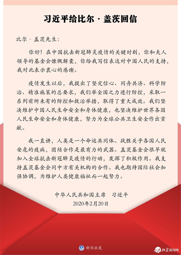 2月20日,在給美國蓋茨基金會聯(lián)席主席比爾·蓋茨的回信中,習近平主席這樣寫道。